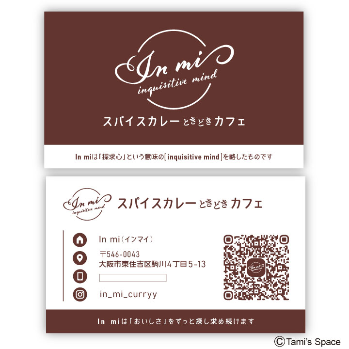 大阪市東住吉区駒川商店街近くに2025年11月のオープン予定のIn mi(インマイ)様のショップカードを制作させていただきました。表面にはロゴを大きく配置し、裏面はQRコードで実店舗とコーヒーのネットショップ、メール等に誘導しています。店名のIn mi(インマイ)の謂れについても記載しました。